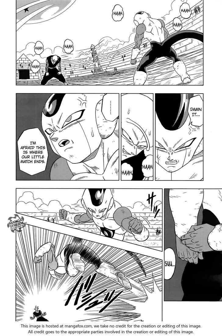 With Goku and Frost transformed, the battle can truly begin. Frost attacks, though Goku confidently deflects all incoming physical and ki-based attacks. Goku smirked, grabbing Frost by the wrist and interrupting his attack sequence, continuing to kick the air. Frost bounces back and goes at it again as Champ watches, seemingly annoyed. Frost tries to push Goku back with a kiai blast, but Goku is able to resist and return the favor in kind.