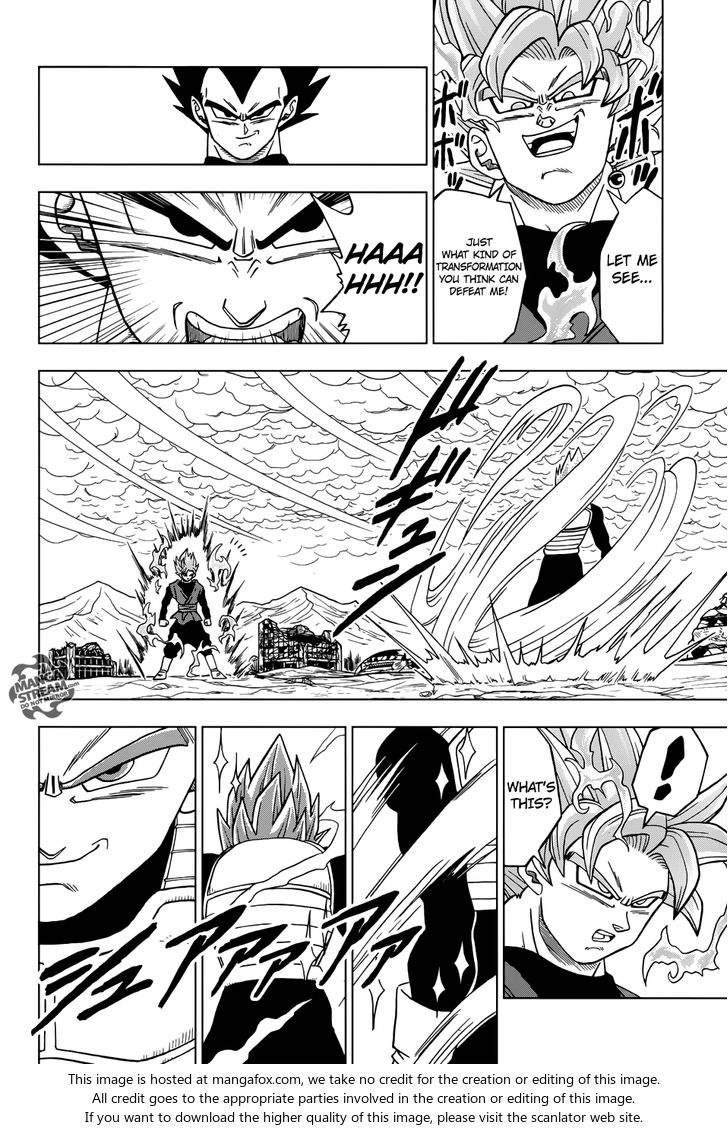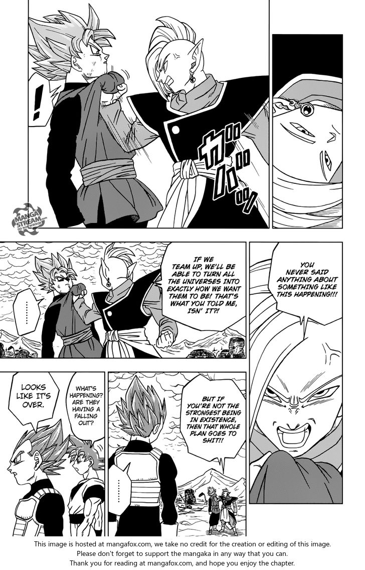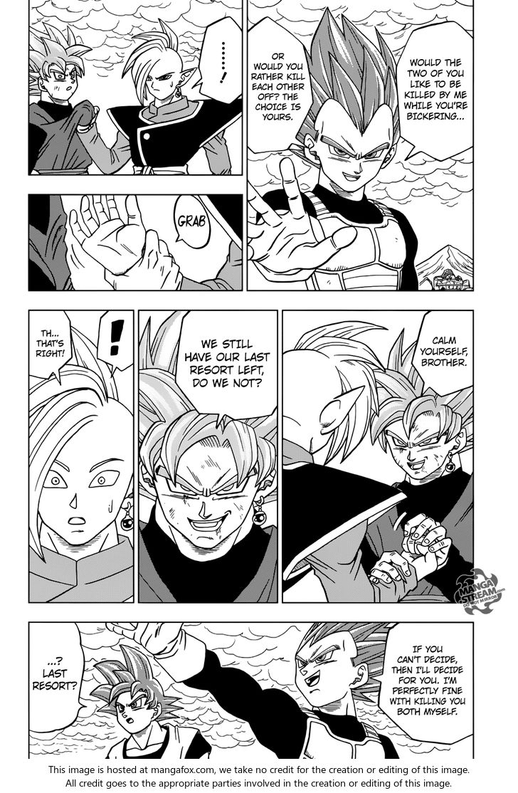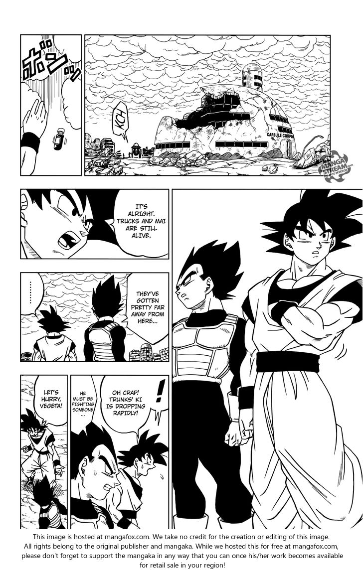 Meanwhile, Goku and Vegeta are back in the future. Everyone is alive, but the energy signatures are dropping. The two arrive in time and Vegeta demands that she confront Black as Goku prepares to use Mafūba on Zamasu. Goku leaves to give Trunks a senza first, and though Zamasu fires a shot to stop him, Goku teleports away with both Trunks and Kaiōshin in tow. Mai runs into the trio and asks for senzu to give to Gowasu.