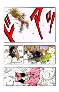 “Kakarrot… An amazing guy, you are… That Majin Boo, he was an opponent I couldn’t stand against at all… The only one who can fight him is you… I have a feeling you somehow know … Why is it that I, who should be a genius, can’t compete with you…” Boo kicks Goku. “I thought it was because you had things you wanted to protect…” Goku hits Boo with a light explosion. “I thought your strong will to protect brought mysterious powers… I guess it was definitely there, but now I have the same thing… I fought for my way of thinking, for my pleasure, for killing my enemies and for my pride…” Boo bites Goku’s arm.