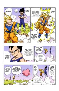 Goku shields himself from a big Kamehameha from Boo and Satan thinks it’s a really intense dream. Boo thinks it’s won when suddenly another Kamehameha shoots out of the smoke, blowing Boo to pieces. As the smoke clears, it’s Goku who says, “Stupid!! This was a real Kamehameha!!” Goku is mad that Bo’s physical strength never goes down no matter what you do to him and he can always return to a new state. Vegeta goes to Goku and Goku hopes it’s not time to shut down. Vegeta says he never meant to fight anyway. Vegeta says that Boo is definitely stronger than you think, but so is Kakarrot. She tells him to go ahead and finish Boo. Goku thought he could, but he hadn’t gotten the chance yet. He needs a minute to collect his ki. Goku wishes they wouldn’t destroy Potara. Boo begins to reform again, taunting them, so Vegeta says he’ll give him the minute he needs.